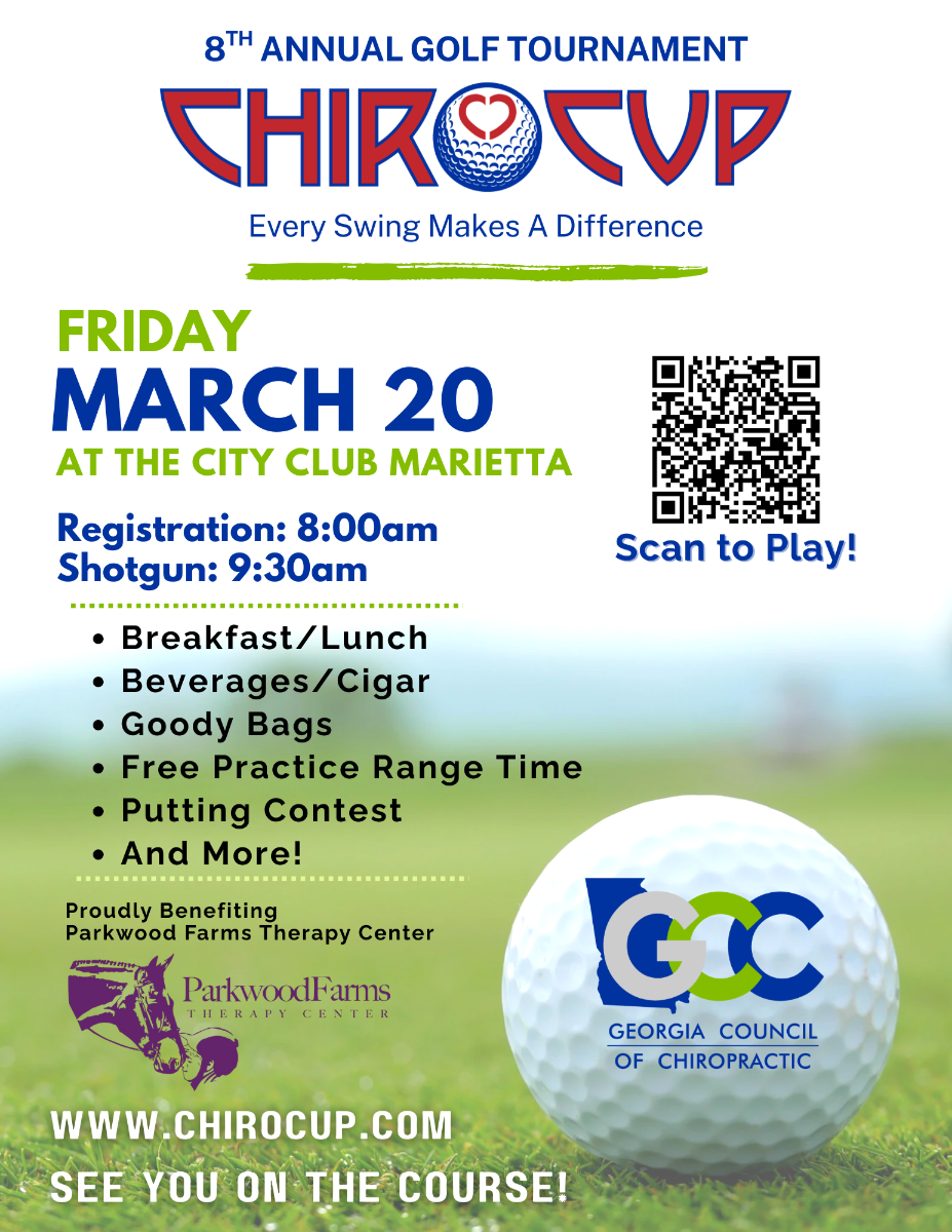 Join us for the 8th Annual ChiroCup Golf Tournament on Friday, March 20th at Marietta City Club for a full day on the course.